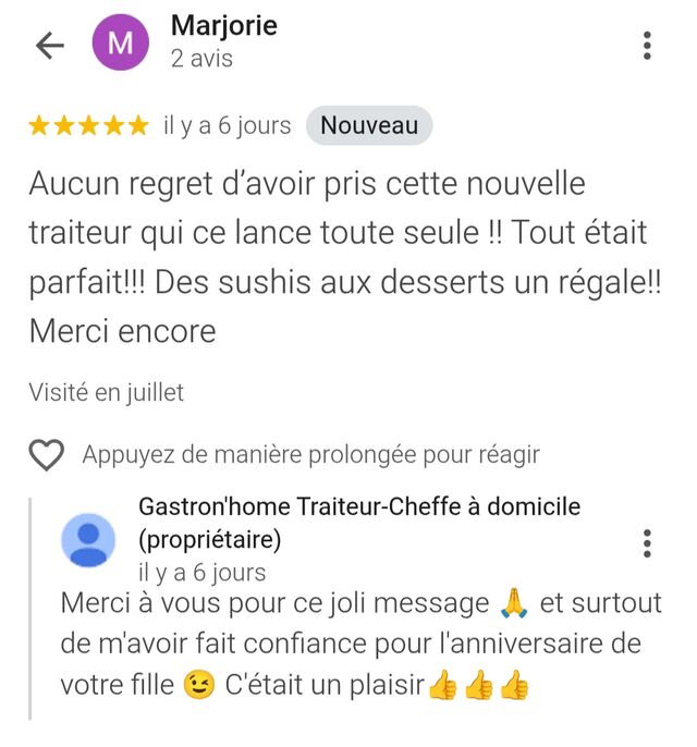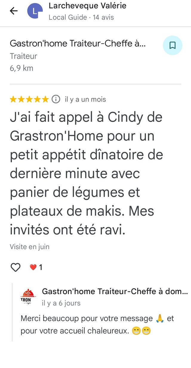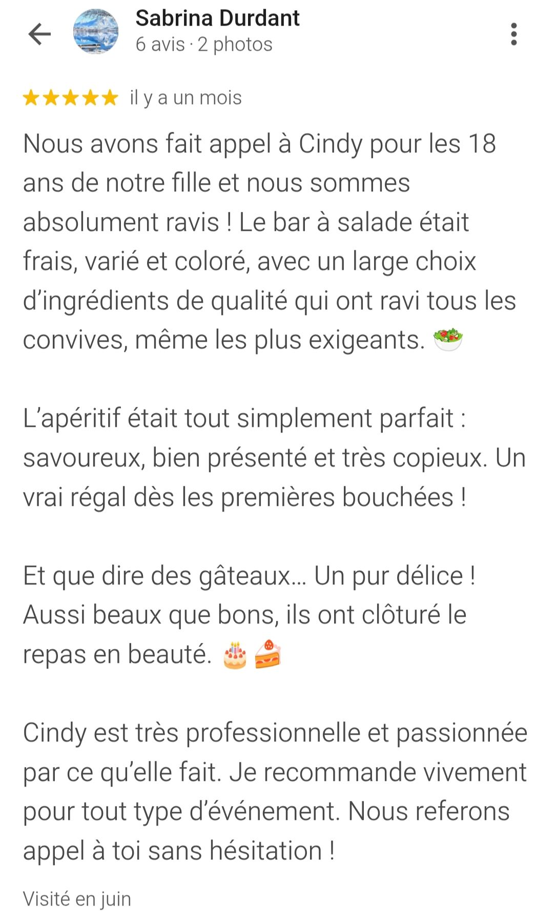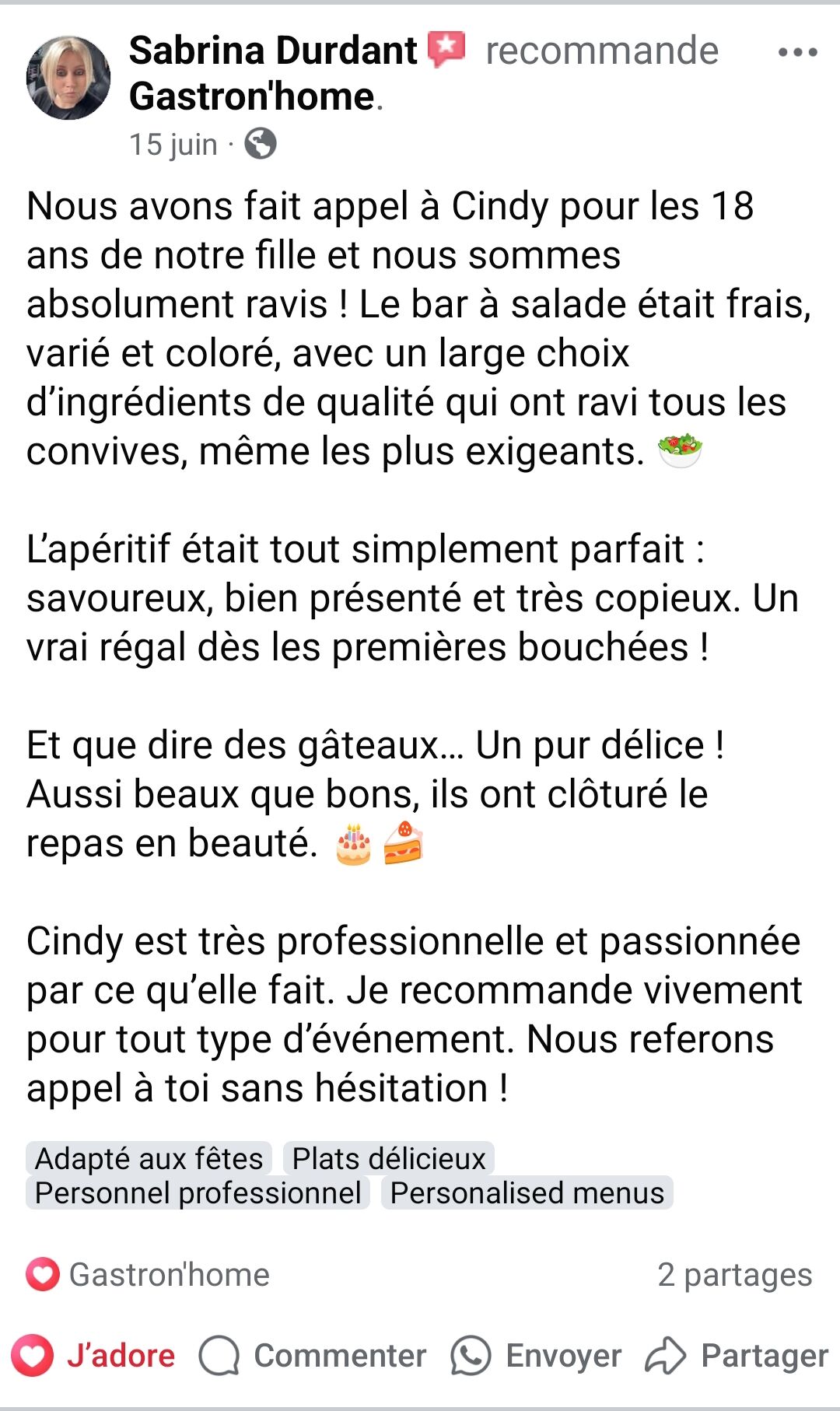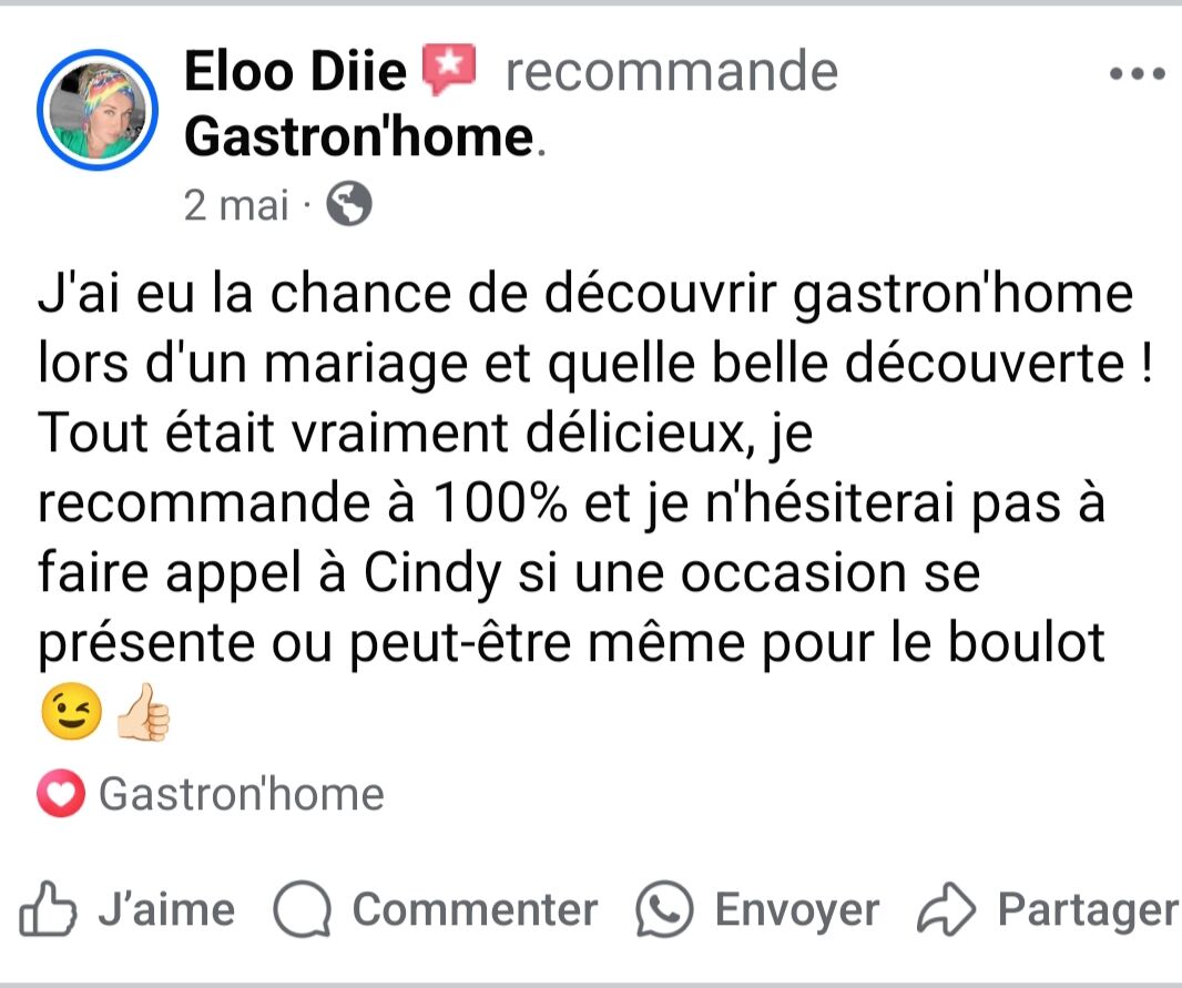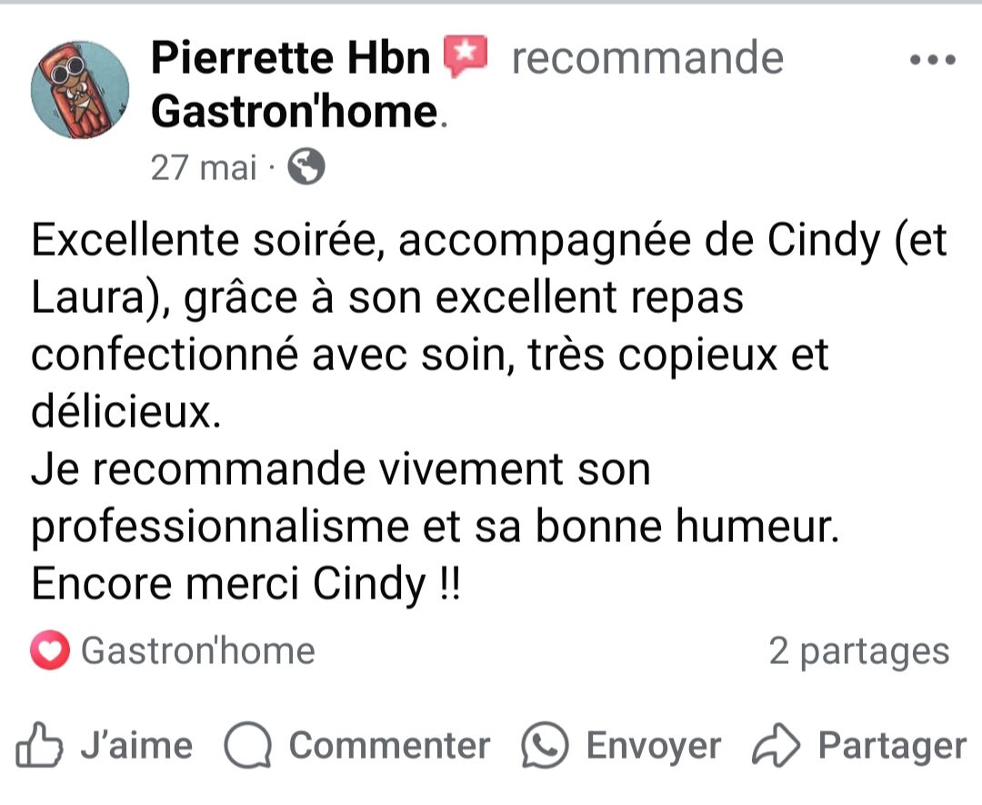 Dotée d'un grand sens de l'humour, j'aime partager ma joie de vivre dans chacun de mes échanges avec les gens mais aussi dans les mets que je propose.